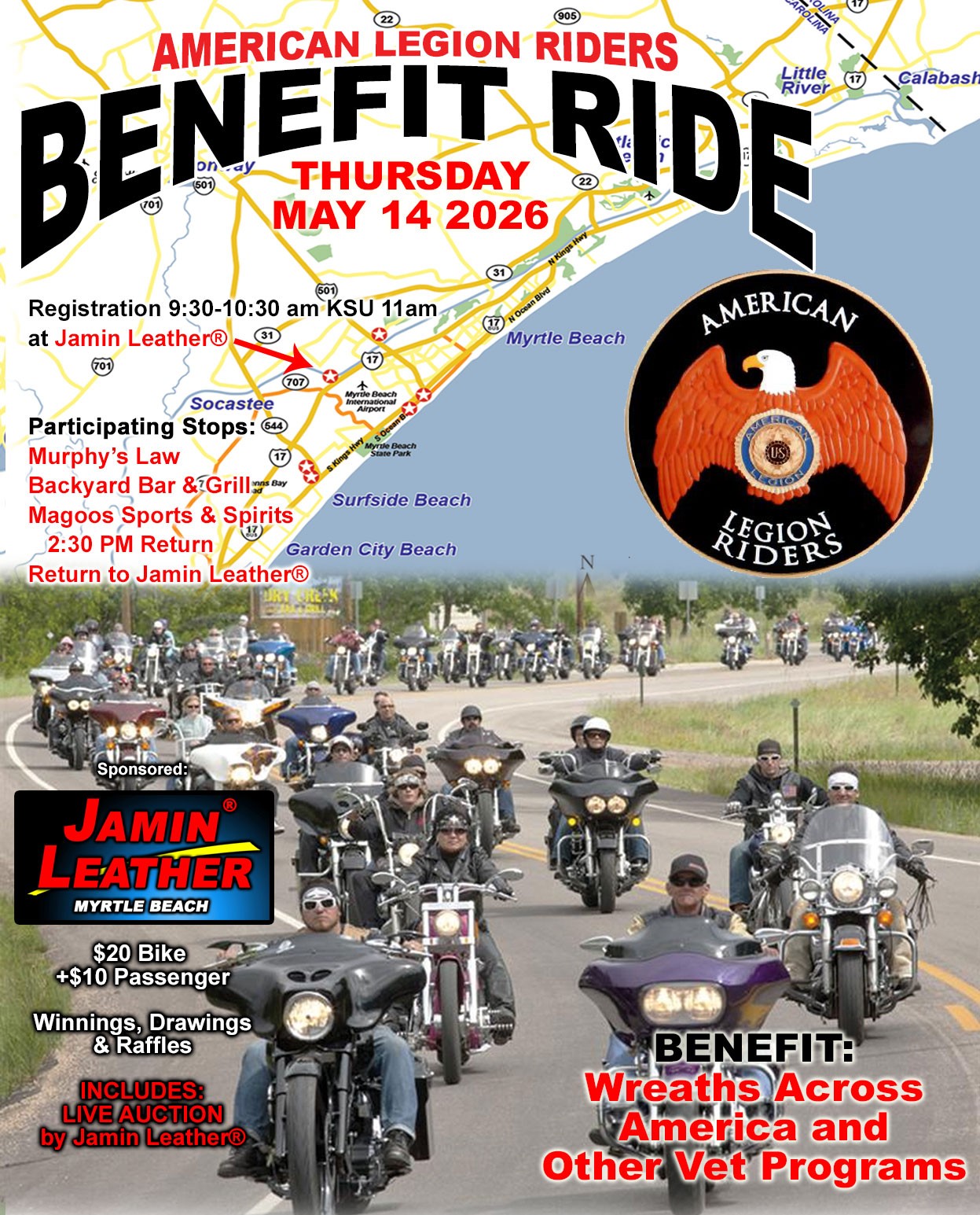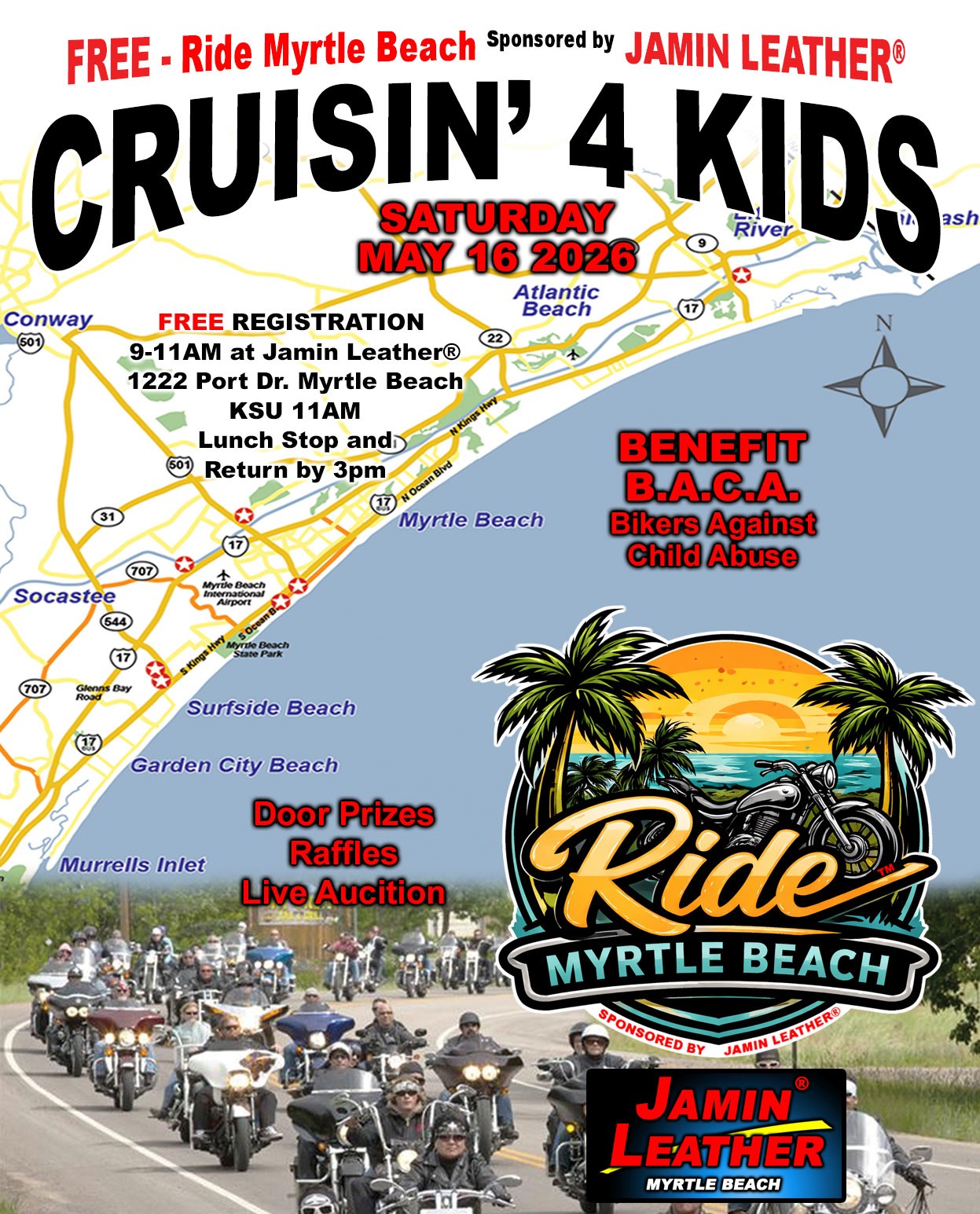 Horry County’s Official bike week starts in May traditionally including Mothers Day for 10 days. The Fall Rally is a shorter rally and always includes the 1st Saturday of October. The Grand Strand sponsors 5-6 vendor locations in and around Myrtle Beach. Jamin Leather® is planning a healthy turnout during Bike Week, located in the heart of Myrtle Beach near the Myrtle Beach Airport and Market Commons with vendors, celebrity visits, benefit rides and leather auctions daily that generally start at 3pm. Jamin Leather® raised money for several veteran charities during the each rally. Come join us at Jamin Leather®, the sponsor of this website.
